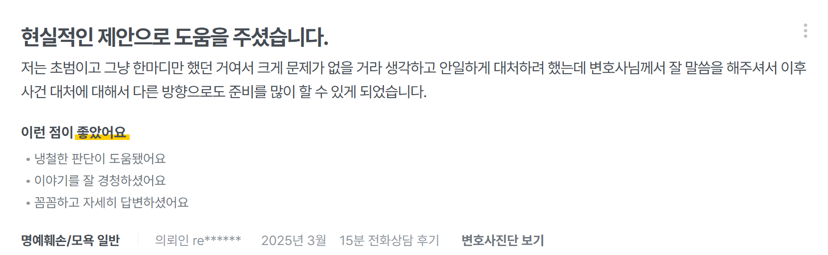 Àú´Â ÃʹüÀÌ°í ±×³É ÇѸ¶µð Çß´ø °Å¿©¼ Å©°Ô ¹®Á¦°¡ ¾øÀ» °Å¶ó »ý°¢ÇÏ°í ¾ÈÀÏÇÏ°Ô ´ëóÇÏ·Á Çߴµ¥ º¯È£»ç´Ô²²¼ Àß ¸»¾¸À» ÇØ Áּż ÀÌÈÄ »ç°Ç ´ëó¿¡ ´ëÇØ¼ ´Ù¸¥ ¹æÇâÀ¸·Îµµ Áغñ¸¦ ¸¹ÀÌ ÇÒ ¼ö ÀÖ°Ô µÇ¾ú½À´Ï´Ù.