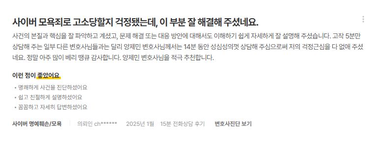 »ç°ÇÀÇ º»Áú°ú ÇÙ½ÉÀ» Àß ÆÄ¾ÇÇÏ°í °è¼Ì°í, ¹®Á¦ ÇØ°á ¶Ç´Â ´ëÀÀ ¹æ¾È¿¡ ´ëÇØ¼µµ ÀÌÇØÇϱ⠽±°Ô ÀÚ¼¼ÇÏ°Ô Àß ¼³¸íÇØ Áּ̽À´Ï´Ù. °íÀÛ 5ºÐ¸¸ »ó´ãÇØ ÁÖ´Â ÀϺΠ´Ù¸¥ º¯È£»ç´Ôµé°ú´Â ´Þ¸® ¾çÁ¦¹Î º¯È£»ç´Ô²²¼´Â 14ºÐ µ¿¾È ¼º½É¼ºÀDz¯ »ó´ãÇØ ÁÖ½ÉÀ¸·Î½á ÀúÀÇ °ÆÁ¤±Ù½ÉÀ» ´Ù ¾ø¾Ö Áּ̳׿ä. Á¤¸» ¾ÆÁÖ ¸¹ÀÌ º£¸® ¶¯Å¥ °¨»çÇÕ´Ï´Ù. ¾çÁ¦¹Î º¯È£»ç´ÔÀ» Àû±Ø ÃßõÇÕ´Ï´Ù.