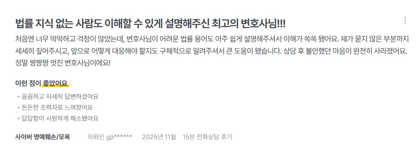 óÀ½¿£ ³Ê¹« ¸·¸·ÇÏ°í °ÆÁ¤ÀÌ ¸¹¾Ò´Âµ¥, º¯È£»ç´ÔÀÌ ¾î·Á¿î ¹ý·ü ¿ë¾îµµ ¾ÆÁÖ ½±°Ô ¼³¸íÇØÁּż ÀÌÇØ°¡ ½ï½ï µÆ¾î¿ä. Á¦°¡ ¹¯Áö ¾ÊÀº ºÎºÐ±îÁö ¼¼¼¼È÷ ¤¾îÁֽðí, ¾ÕÀ¸·Î ¾î¶»°Ô ´ëÀÀÇØ¾ß ÇÒÁöµµ ±¸Ã¼ÀûÀ¸·Î ¾Ë·ÁÁּż Å« µµ¿òÀÌ µÆ½À´Ï´Ù. »ó´ã ÈÄ ºÒ¾ÈÇß´ø ¸¶À½ÀÌ ¿ÏÀüÈ÷ »ç¶óÁ³¾î¿ä. Á¤¸» ¯¯¯ ¸ÚÁø º¯È£»ç´ÔÀÌ¿¡¿ä!